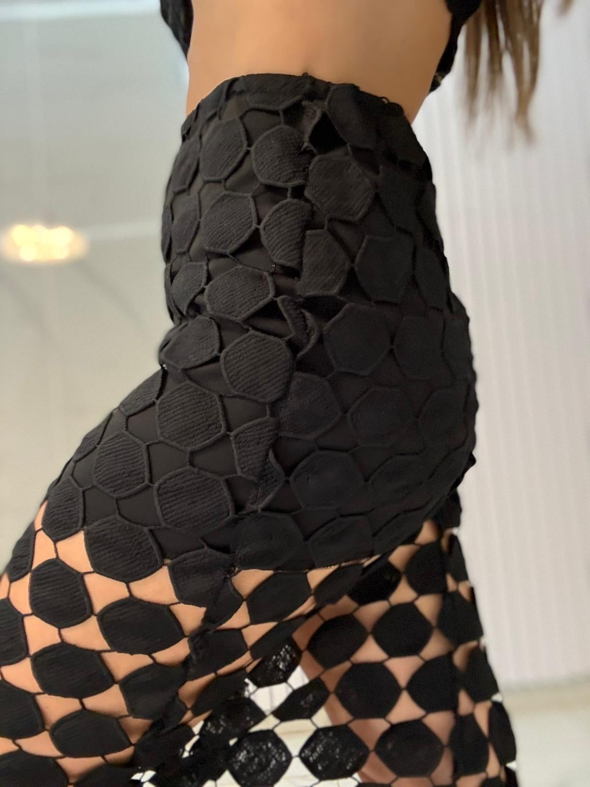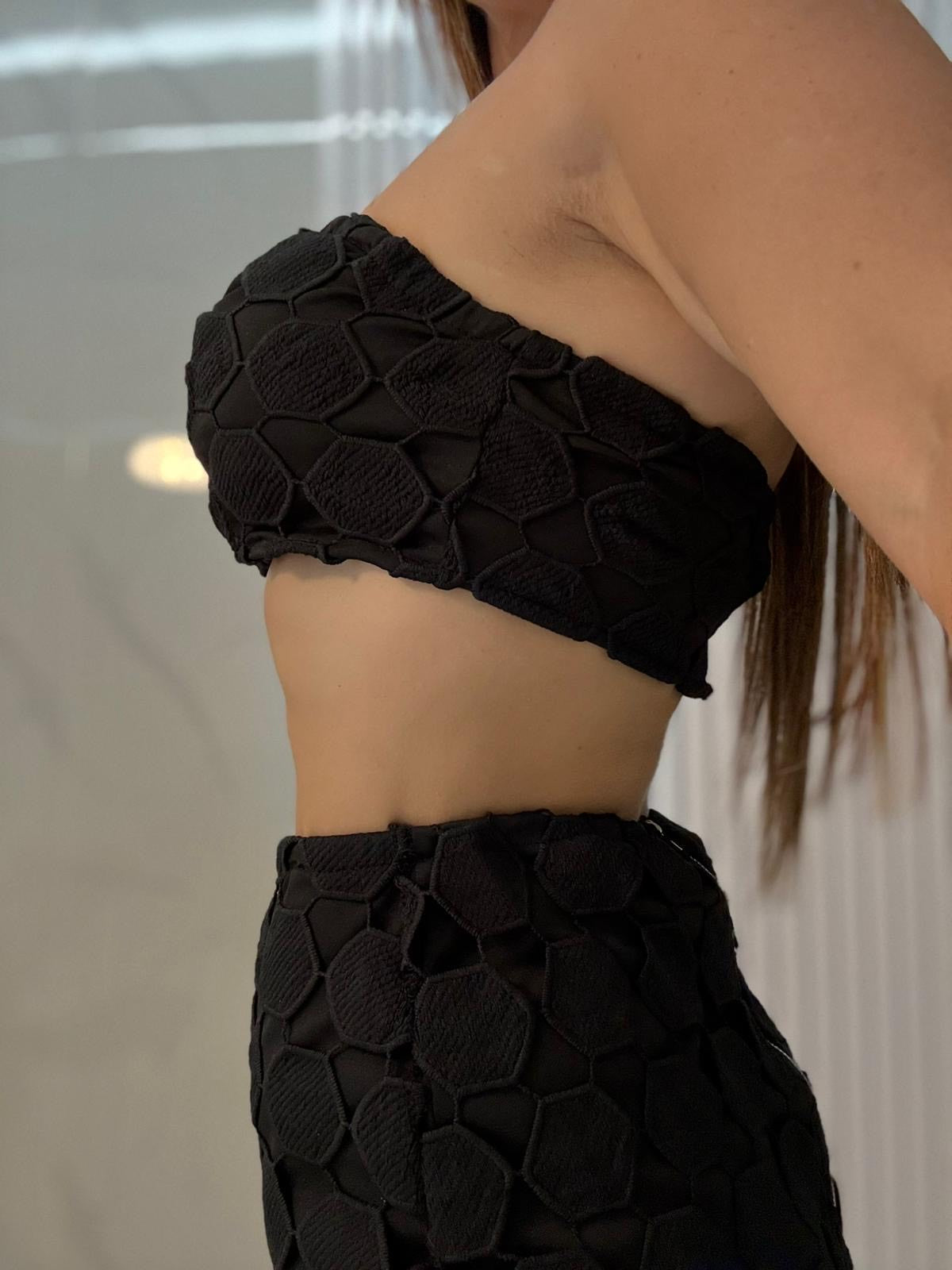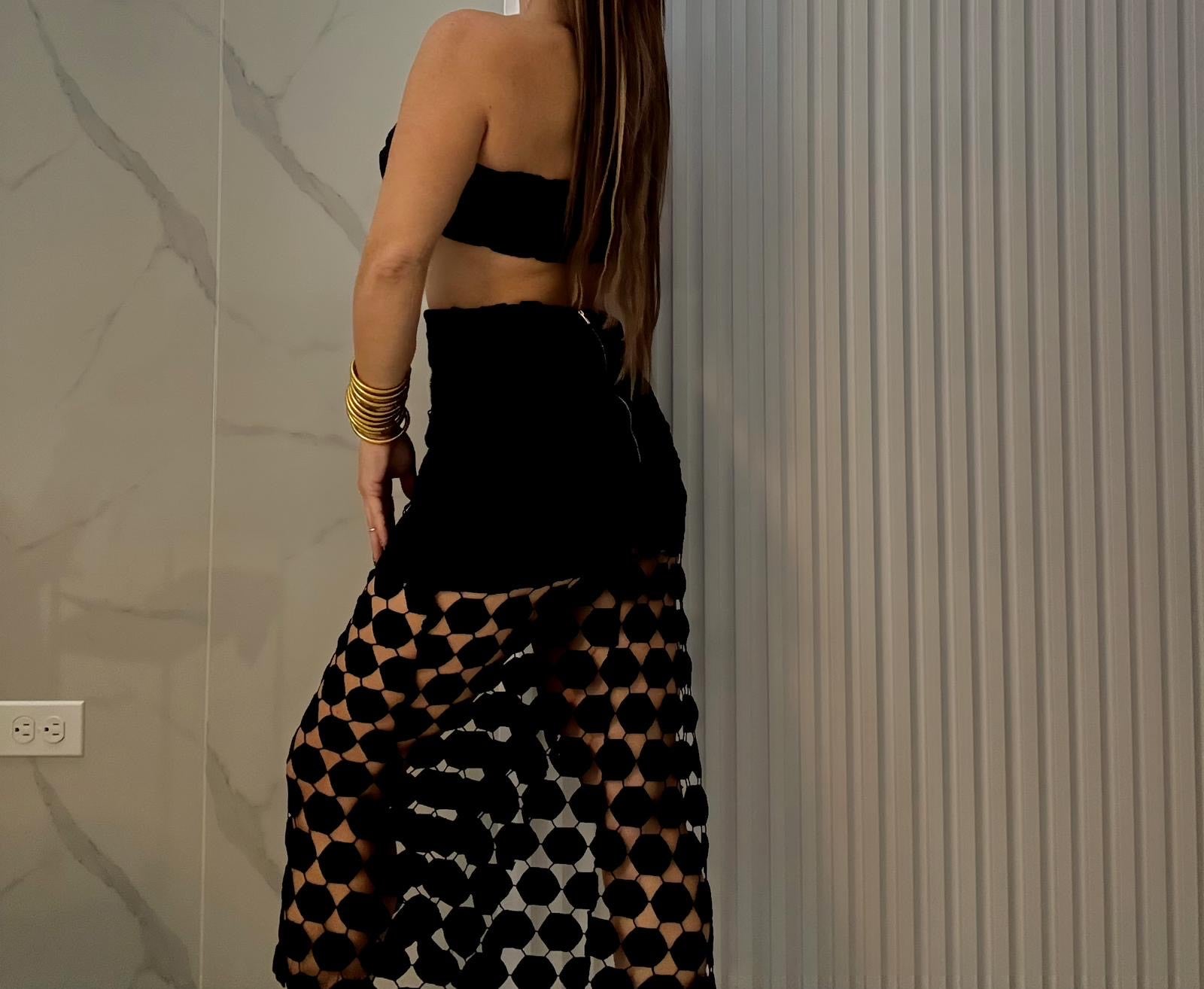 Este set negro de dos piezas combina un top tipo bandeau con una falda larga semi-transparente de diseño geométrico, ideal para destacar en ocasiones especiales o eventos junto al mar.
